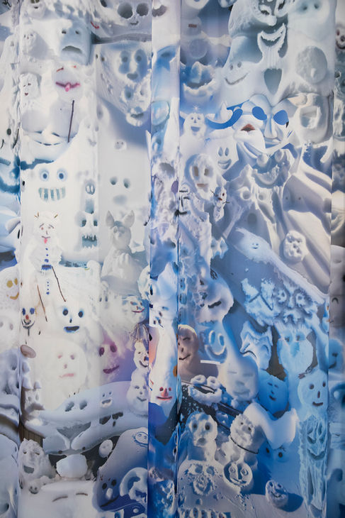 \Funny Snow Face, 2023; Cantonale Berne Jura, Museé jurassien des Arts, Moutier; 10 x 3 m curtain made of polyester fabric, eyelets, metal rod, AI-system